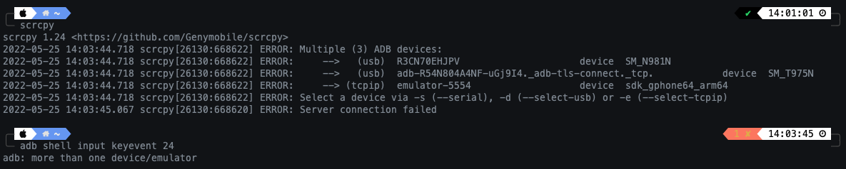 여러 기기가 연결되었을 때, adb 명령어를 그대로 실행하면 하나만 선택하라는 에러가 나타난다.