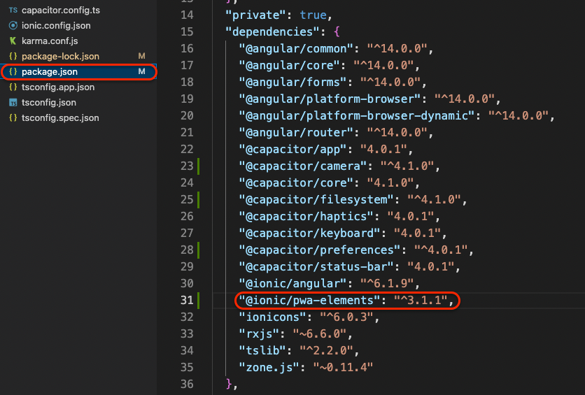 설치가 정상적으로 완료되었고, Dependency 를 관리하는 "package.json" 파일에도 "@ionic/pwa-elements" 가 추가되어있다. 만약, 설치가 완료되었음에도 "package.json" 에 추가되어있지 않다면, 위 이미지처럼 추가를 해주면 될 것이다.