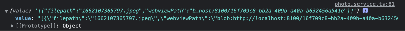 photoList 를 로그로 찍어보았을 때 출력된 값이다. PHOTO_STORAGE 값으로 찾은 Value 값은 "value" 라는 Key 값과 저장한 배열이 JSON 문자열로 된 하나의 JSON 객체로 되어있었다. 그래서, photoList.value 를 통해 저장했던 JSON 문자열을 받을 수 있던 것이다.