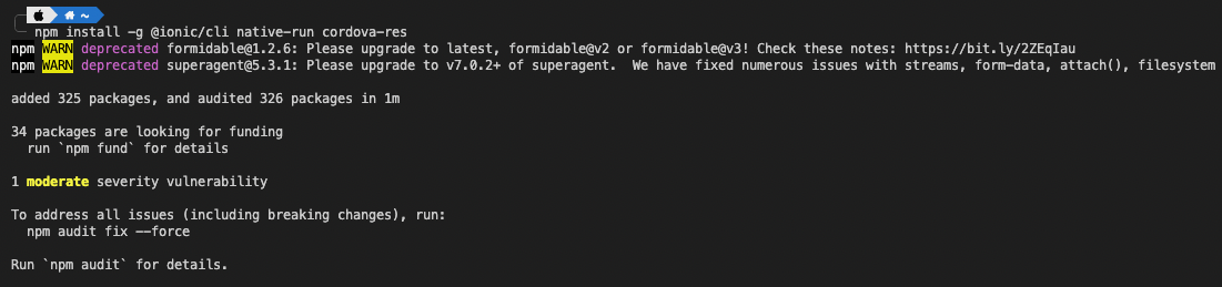 NPM 을 통해 "Ionic CLI", "native-run", "cordova-res" 라는 패키지들을 글로벌로 설치한다. Ionic 을 사용할 것이니 "Ionic CLI" 를 설치하는 것이고, 각종 Device 와 Simulator/Emulator 에서 Native Binary 로 앱이 동작하도록 해주는 "native-run" 을 설치한다. 마지막으로, Splash 화면과 앱 아이콘을 생성해주는 "Cordova-res" 를 설치한다.