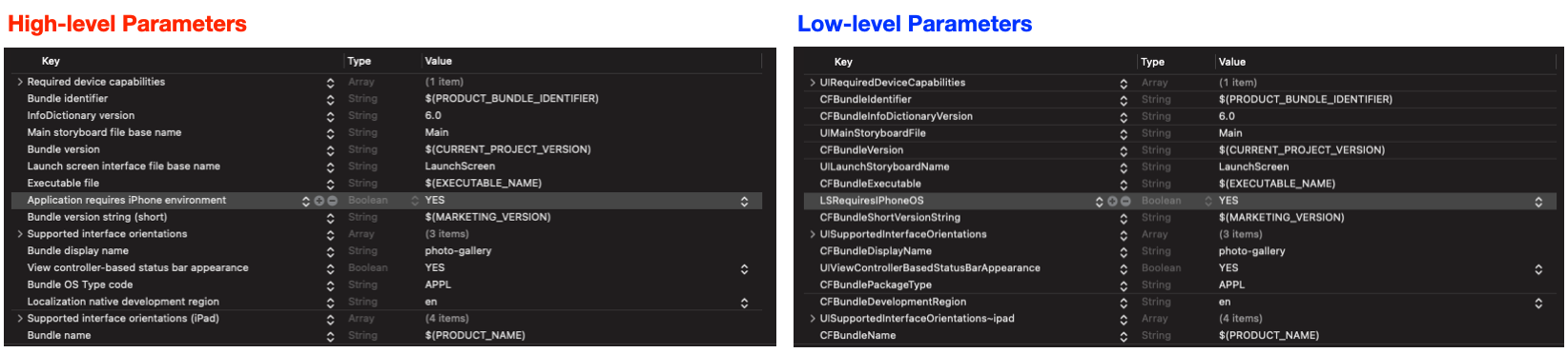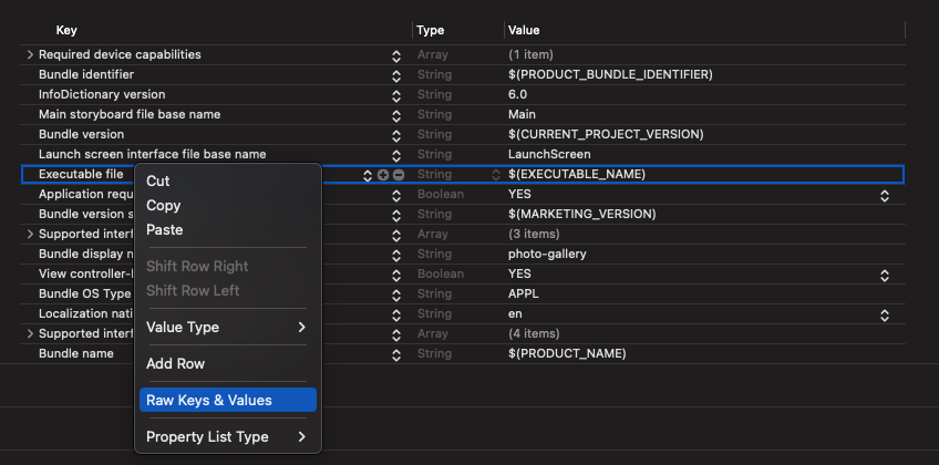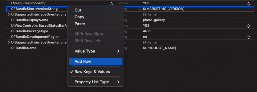 수정해야하는 "Info.plist" 목록을 나타내며, 현재는 High-level parameter 상태로 보여주고 있다. Xcode 가 기본적으로 High-level 로 보여주는 것인데, 지금은 Low-level parameter 로 보는 것이 좋다. Low-level parameter 상태로 보기 위해서는 [Custom iOS Target Properties] 에서 보여주는 리스트의 위에서 우클릭을 하여 [Raw Keys/Values] 를 클릭한다.