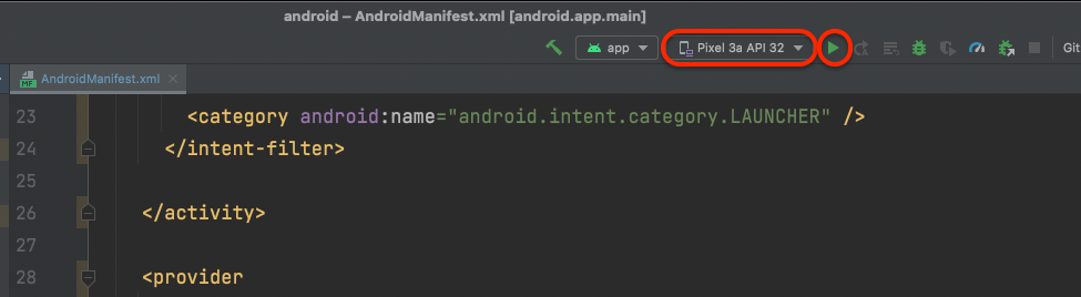 기본으로 세팅되어있는 INTERNET 권한의 아래에 위 2개의 권한들을 명시해주면 된다. 권한을 추가했다면, 상단에 [RUN] 버튼을 클릭하여 실행시켜준다. 실제 기기가 연결되었다면, 기기 모델명이 [RUN] 버튼 옆에 나올 것이다. 그렇지 않다면 Android Emulator 를 생성 및 선택하여 실행시켜준다.
