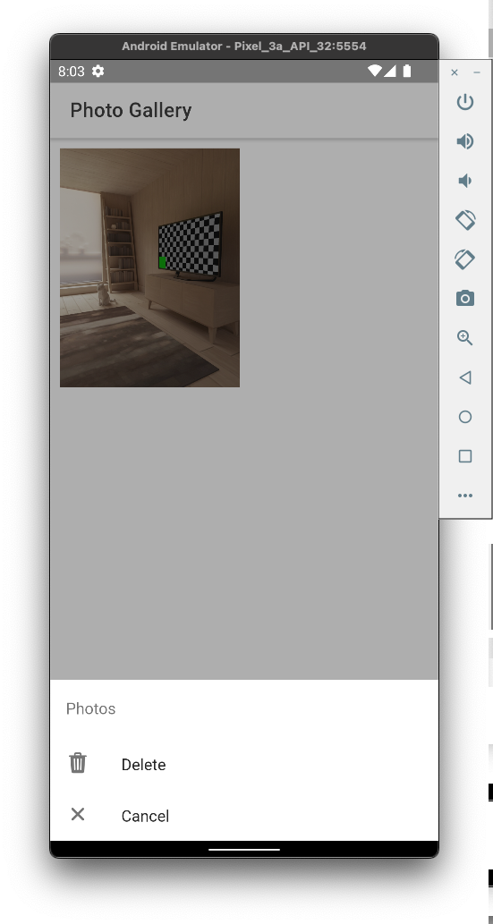 위 코드대로 업데이트 하게 되면, Tab2 에서 나열된 사진들 중에 하나를 클릭 했을 때, [Delete] 버튼과 [Cancel] 버튼이 나오게 된다. 이제 PhotoService 에서 행할 삭제 기능을 구현한다.