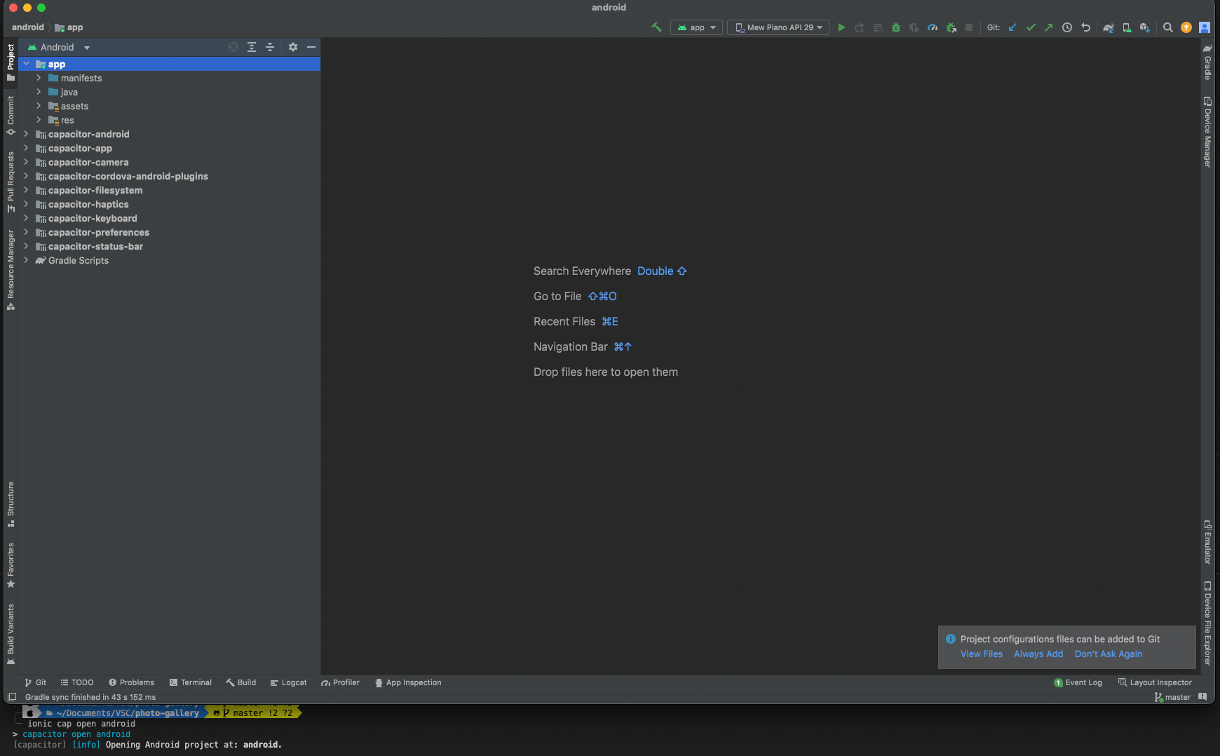 Capacitor iOS 가 Xcode 와 CocoaPod 을 통해 관리된다면, Capacitor Android 는 Android Studio 를 통해서 관리된다. Android 환경에서 실행시키기 전에, iOS 실행 전에 했던 것처럼 사전 작업이 필요하다. 이 또한 "권한 설정"이다.
