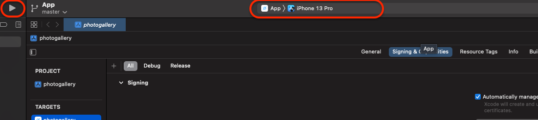 Team 까지 등록을 마쳤다면, Xcode 의 최상단에서 실제로 연결된 Apple 기기나 Simulator 로 키고 싶은 Apple 제품을 선택한 후에 "Build" 버튼을 눌러서 실행시켜준다.