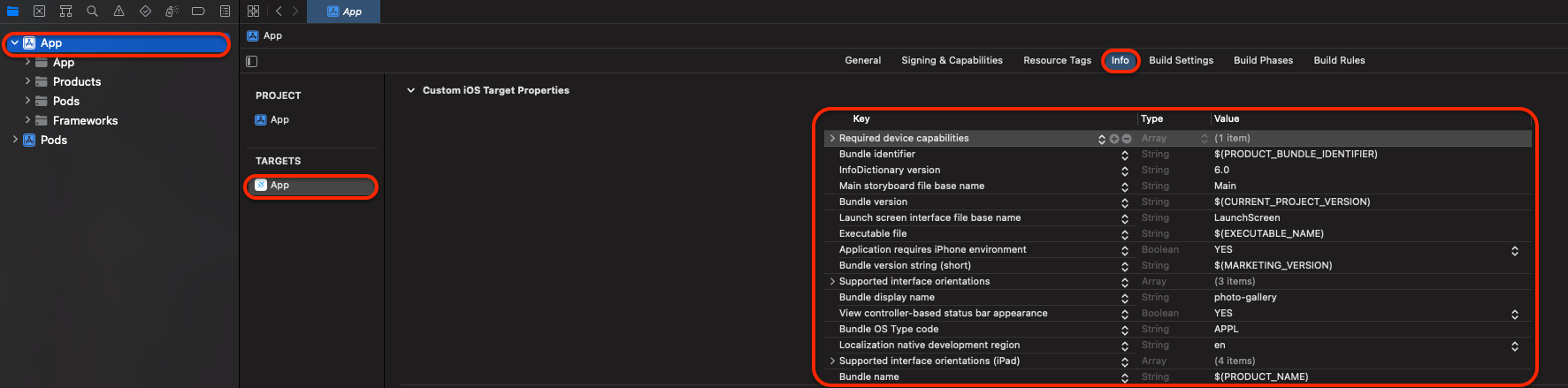 우선, App 의 [Info] 를 클릭하고, [Custom iOS Target Properties] 를 확장시켜준다.