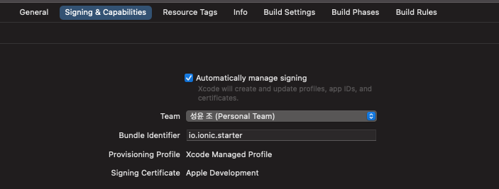 다음은 [Signing & Capabilities] 메뉴에서 [Team] 을 설정한다.