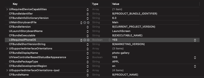 일부 네이티브 플러그인이 정상적으로 작동하기 위해서는 사용자 권한을 얻는 것이 필수이다. Photo Gallery 앱은 Camera Plugin 을 포함하고 있다. iOS 는 Ionic 의 "Camera.getPhoto()" 함수를 최초에 호출하게 되면, model dialog 를 자동으로 보여준다. 그리고 사용자에게 Camera 권한이 필요함을 알려준다. 정확한 명칭은 "Privacy - Camera Usage" 이며, 해당 권한을 설정하기 위해서 "Info.plist" 파일을 수정해줘야한다.