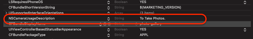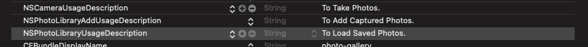 위에 기입한 카메라 사용 목적은 권한 승인창이 열렸을 때 앱이 사용자에게 보여줄 내용이다. "NSCameraUsageDescription" 을 추가한 과정으로 "NSPhotoLibraryAddUsageDescription" 과 "NSPhotoLibraryUsageDescription" 을 추가한다.