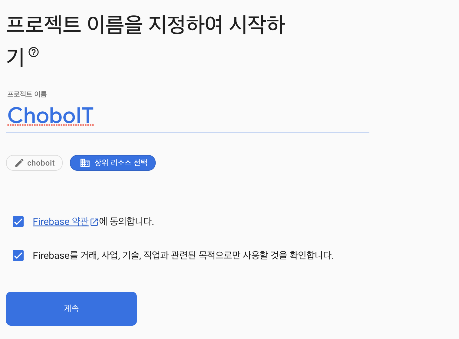 Firebase Project 의 이름을 기입하고, 약관을 동의 체크 해준 후에 [계속] 버튼을 클릭한다.