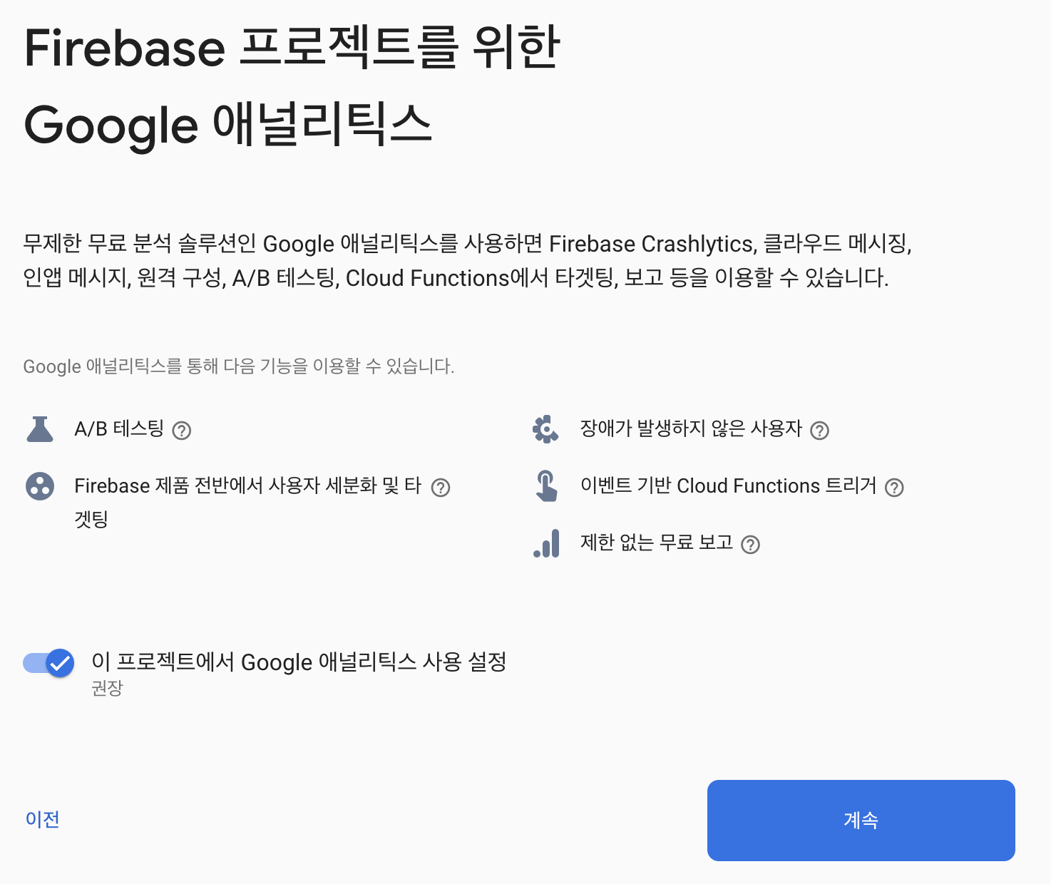 Google Analytics 도 함께 연동해주면 좋기 때문에, 설정된 상태로 [계속] 버튼을 클릭한다.