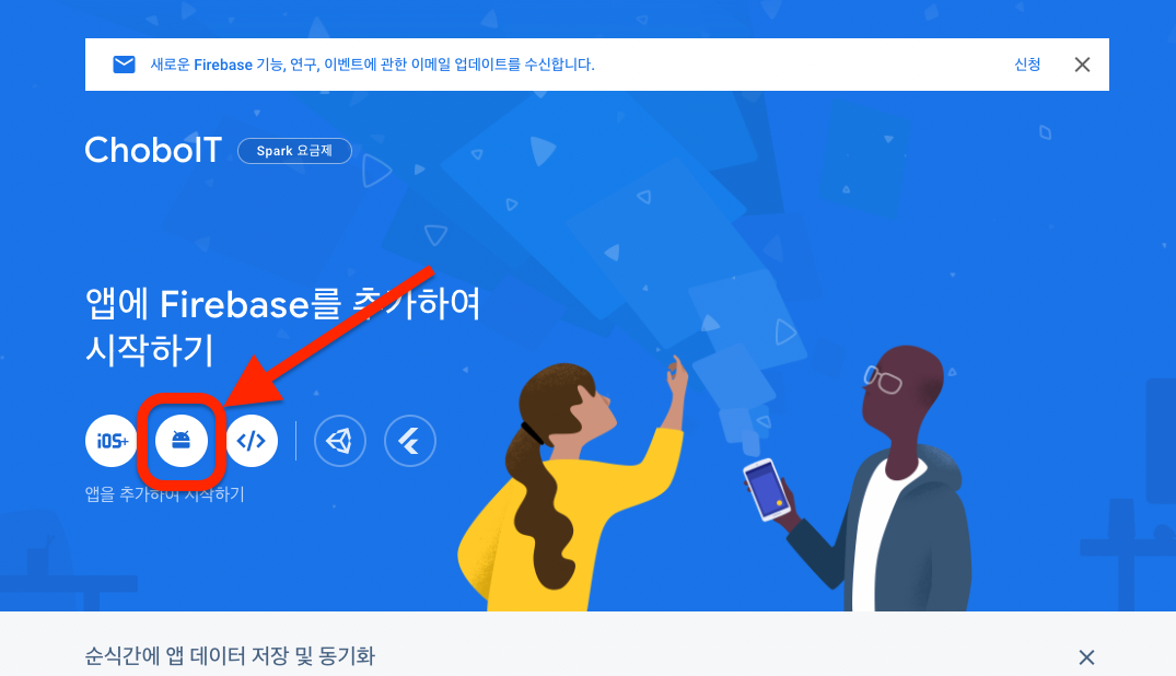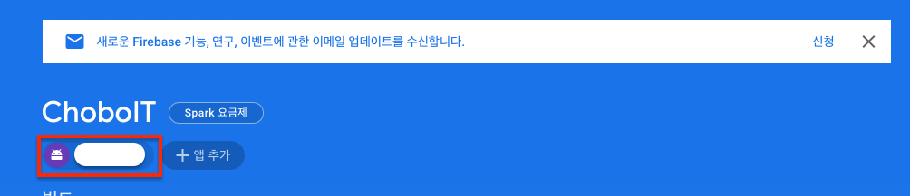 Firebase Console 에 Project 를 생성했다면, Project 안에서 App 을 연동시켜줄 차례이다. Project 의 메인페이지에서 Android App 아이콘을 클릭한다.