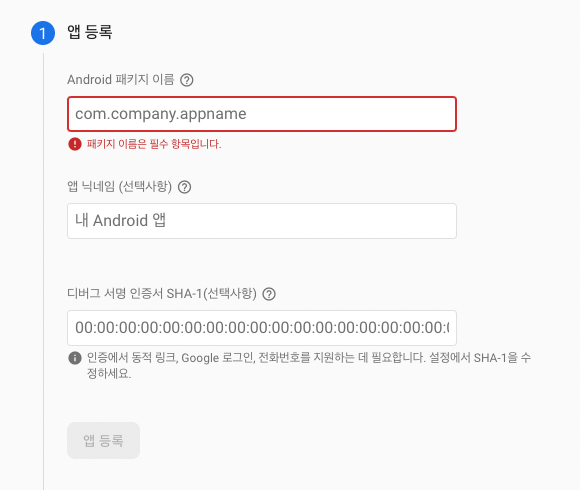 "Android 패키지 이름" 을 기입할 때 주의할 점이 있다. 우선, "Android 패키지 이름" 은 대소문자를 구별하여 인식하기 때문에, 대문자와 소문자가 정확히 일치해야한다. 그리고, 등록한 이후에는 "Android 패키지 이름" 은 수정할 수 없다.