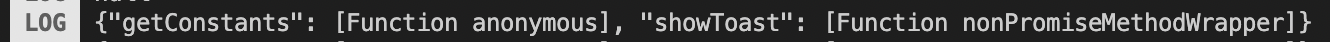 로그 안에 "showToast" 라는 문자열이 나오는 것으로 보아, ReactWrapperModule 안에 "showToast()" 메소드가 있음을 인식한 것으로 보인다. 이제 showToast() 메소드를 호출하는 코드는 다음과 같다.