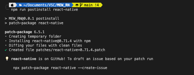 정상적으로 설치되었다면, Patch 를 진행해준다. ios 12.0 으로 수정한 파일은 node_modules 에서 "react-native" 모듈이기 때문에, "react-native" 패키지에 대한 패치만 진행해주면 된다.
