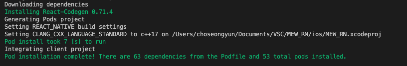 다시 위 명령어를 통해 iOS 빌드를 진행했고, 이번에는 빌드가 정상적으로 마쳐졌다.