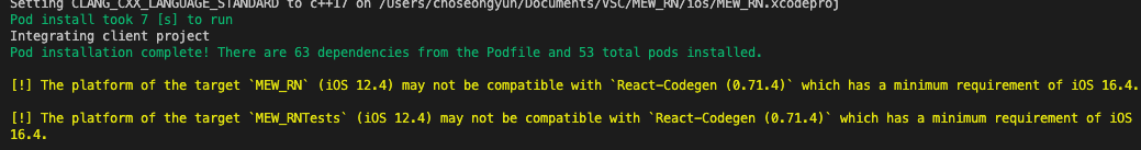 위 Warning 의 내용을 보고, "16.4" 로 수정한 부분이 문제인 것이라 판단했다. 그래서, 다시 react-native 모듈의 codegen_utils 파일로 돌아가서 12.0 으로 수정을 하고, patch-package 를 진행한 후, pod install 을 진행했더니 다음과 같이 정상적으로 성공하였다.