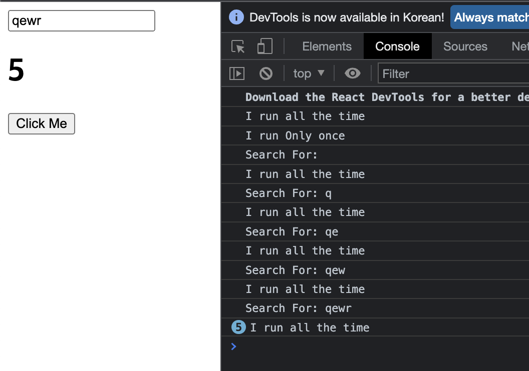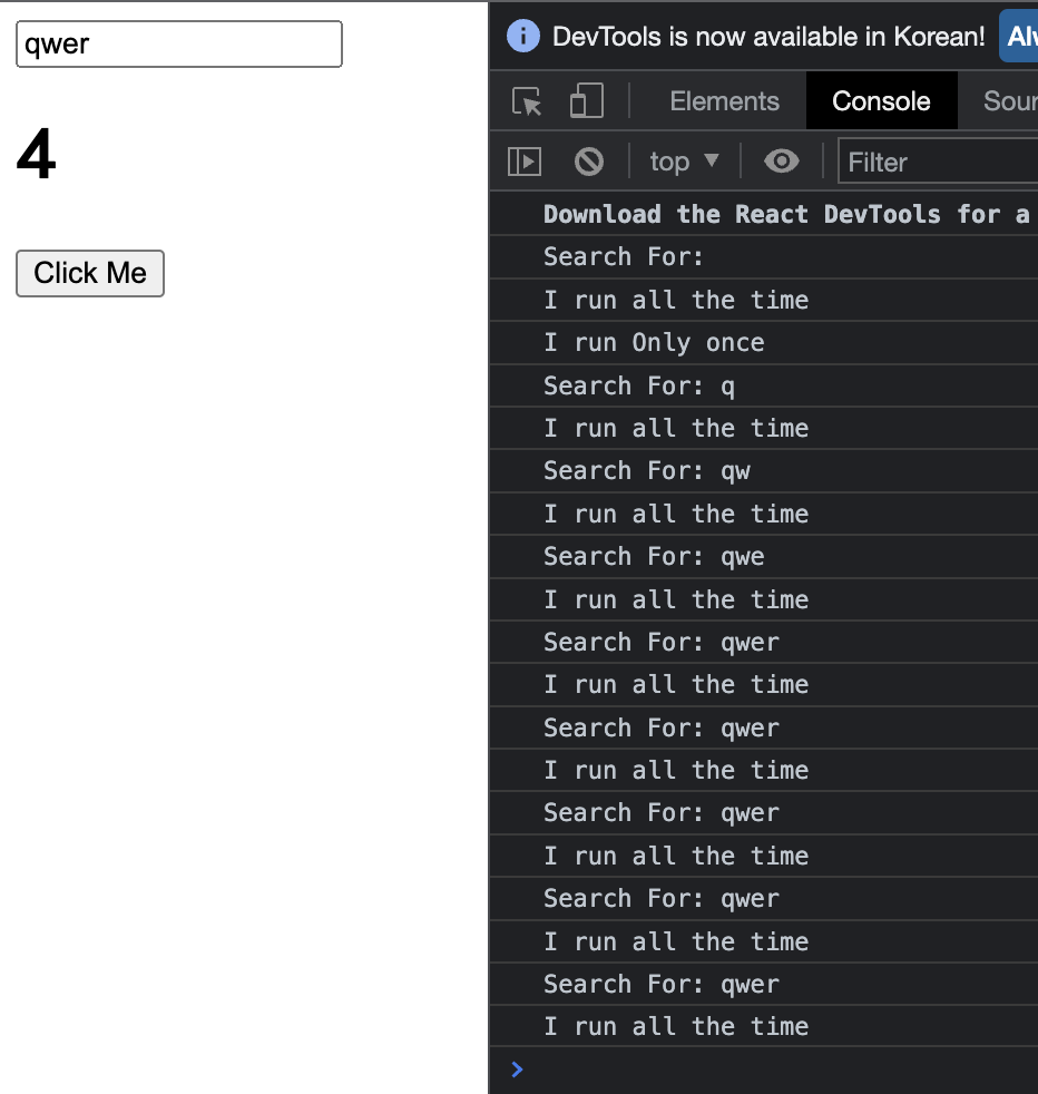 그런데 문제는 keyword 와 counter 가 같은 선상에 있기 때문에, <input> 에 문자열을 입력한 후에 <button> 을 클릭하면 keyword 에 대한 것도 같이 렌더링이 된다는 것이다. 이 때, useEffect 를 사용해서 keyword 와 관련된 렌더링을 counter 와 독립적으로 떨어지게 만들 수 있다.
