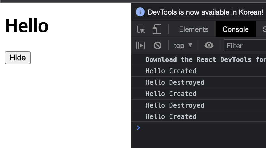 위와 같이 <button> 을 클릭 했을 때, <Hello> 컴포넌트가 생성되며 "Hello Created" 로그가 출력된다. 그리고 다시 <button> 을 클릭하면, <Hello> 컴포넌트가 사라지면서 "Hello Destroyed" 로그가 출력되는 것을 확인할 수 있다. 이처럼 특정 컴포넌트가 사라질 때 실행하고자 하는 함수가 있다면, useEffect 의 첫번째 인자로 넣는 함수 안에 return 문을 추가해주면 된다.