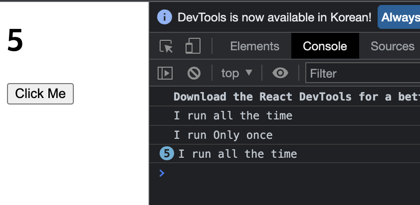 useEffect 안에 있었던 "I run Only once" 라는 문구는 페이지가 로드되면서 한 번 출력되고, 그 외에 콘솔 로그는 클릭할 때마다 출력된다. 이처럼 useEffect 는 페이지가 최초에 렌더링 되었을 때만 호출하고 싶은 함수를 지정할 수 있다.