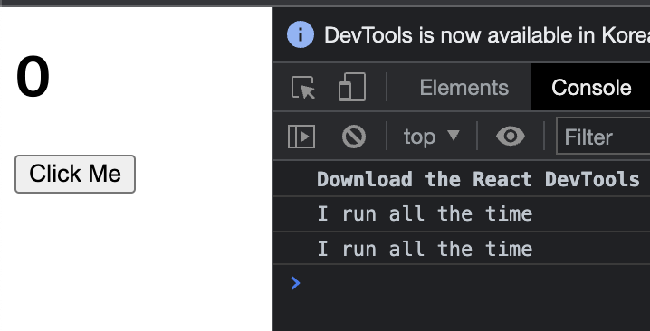 CRA 의 index.js 에서 <App /> 을 불러내고, App 의 내부 코드는 위와 같이 작성되었다. 버튼을 클릭할 때마다, counter 라는 값을 가진 State 의 값이 1 증가하는 코드이다. 그런데, 코드 안에 어색하게 보이는 코드 한 줄이 있다. 바로 "I run all the time" 이라는 문자열을 콘솔로 찍어내는 코드이다. 위의 코드 전체를 브라우저에서 돌리면 어떤 결과가 나올까?