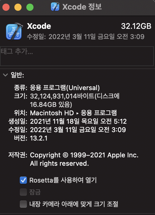 - Xcode를 "Rosetta를 사용하여 열기" 하도록 설정