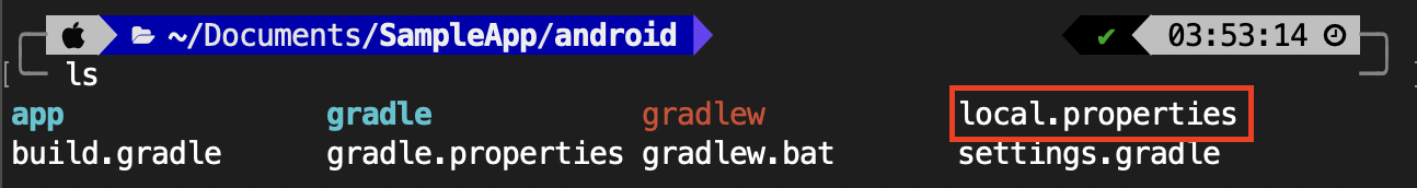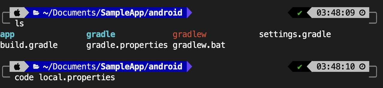 위에 복사했던 Android SDK Location 경로를 React-Native 프로젝트의 Android 폴더에 추가한다. 새로 생성한 프로젝트일 경우 React-Native 프로젝트의 Android 폴더에 local.properties 파일이 없을 것이다. local.properties 파일을 생성하여 Android SDK 경로를 추가한다.