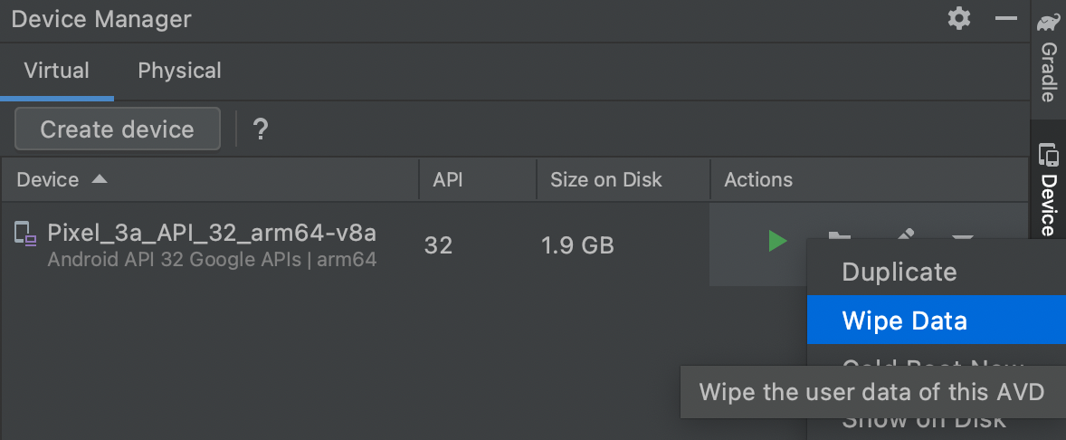 위 에러가 발생할 경우, Android Studio의 Device Manager에서 앱을 설치할 Virtual Device를 Wipe Data 해준다.