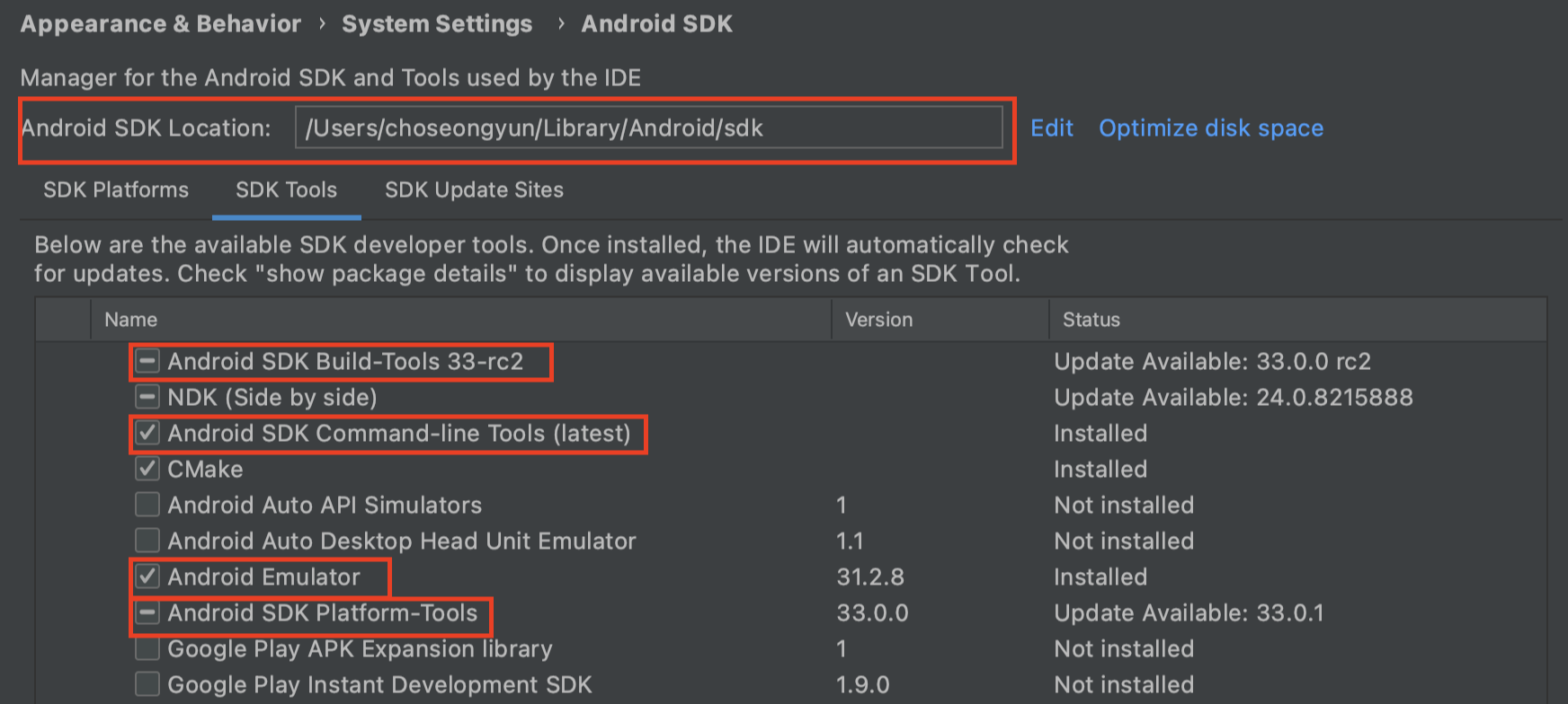 - Android SDK Command-line Tools : 아마 해당 Tools은 체크가 안되어 있을 수도 있다.