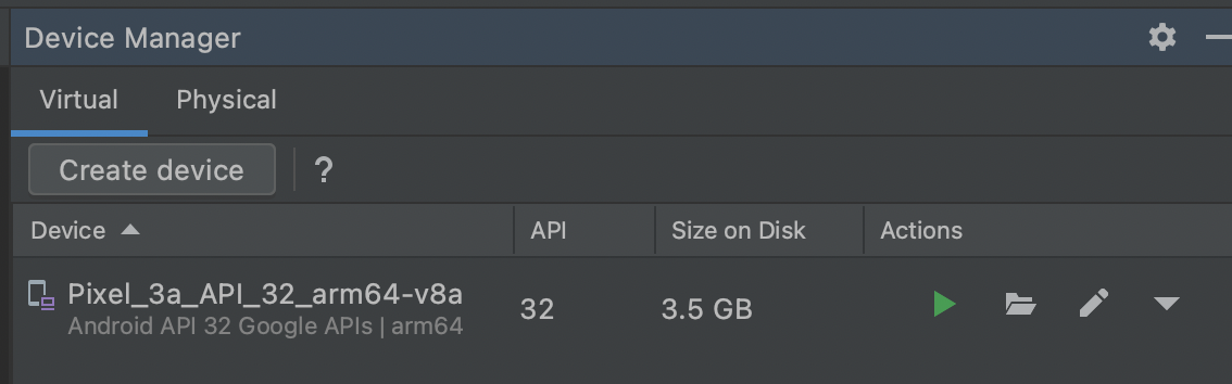 실행에 앞서, Android Studio에서 앱을 실행할 Device를 열어준다.