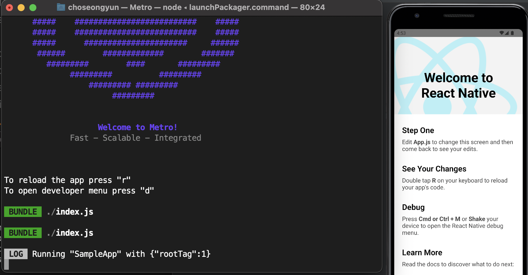 그리고 다음 명령어를 순차적으로 터미널에 입력하여 React-Native의 Android 코드를 실행한다.