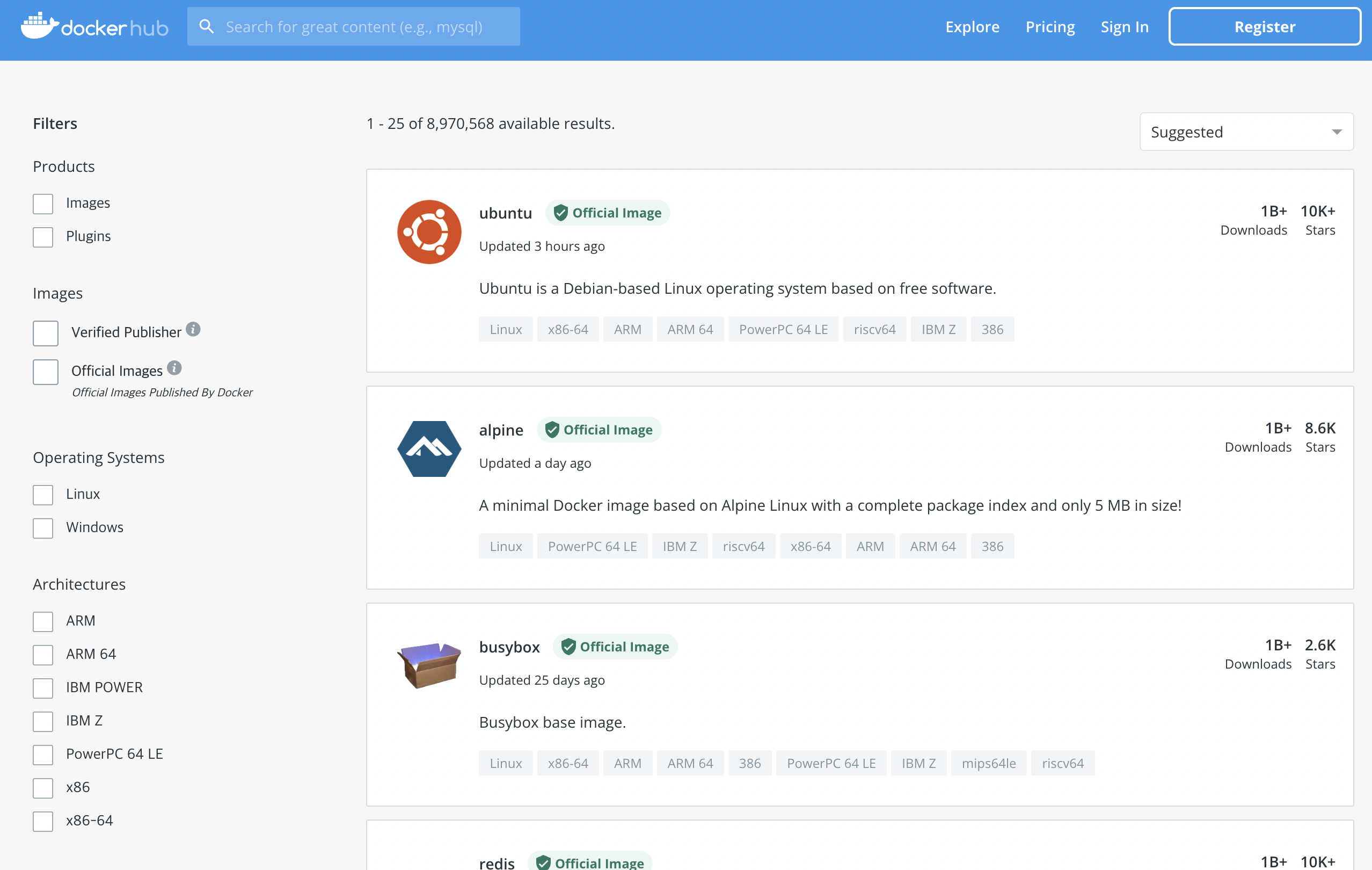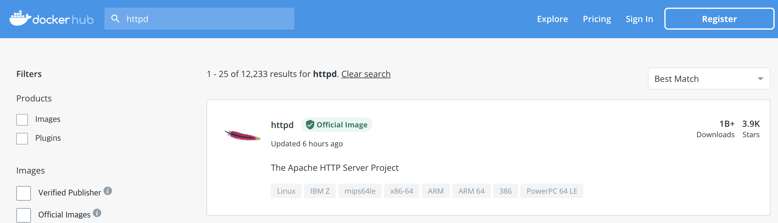 다양한 Docker Image들을 볼 수 있고, 이 중에서 Apache Webserver가 구축된 Image를 찾아보자. 검색창에 "Apache WebServer" 라고 검색해도 되는데, 공식적인 이름은 "httpd" 이다.