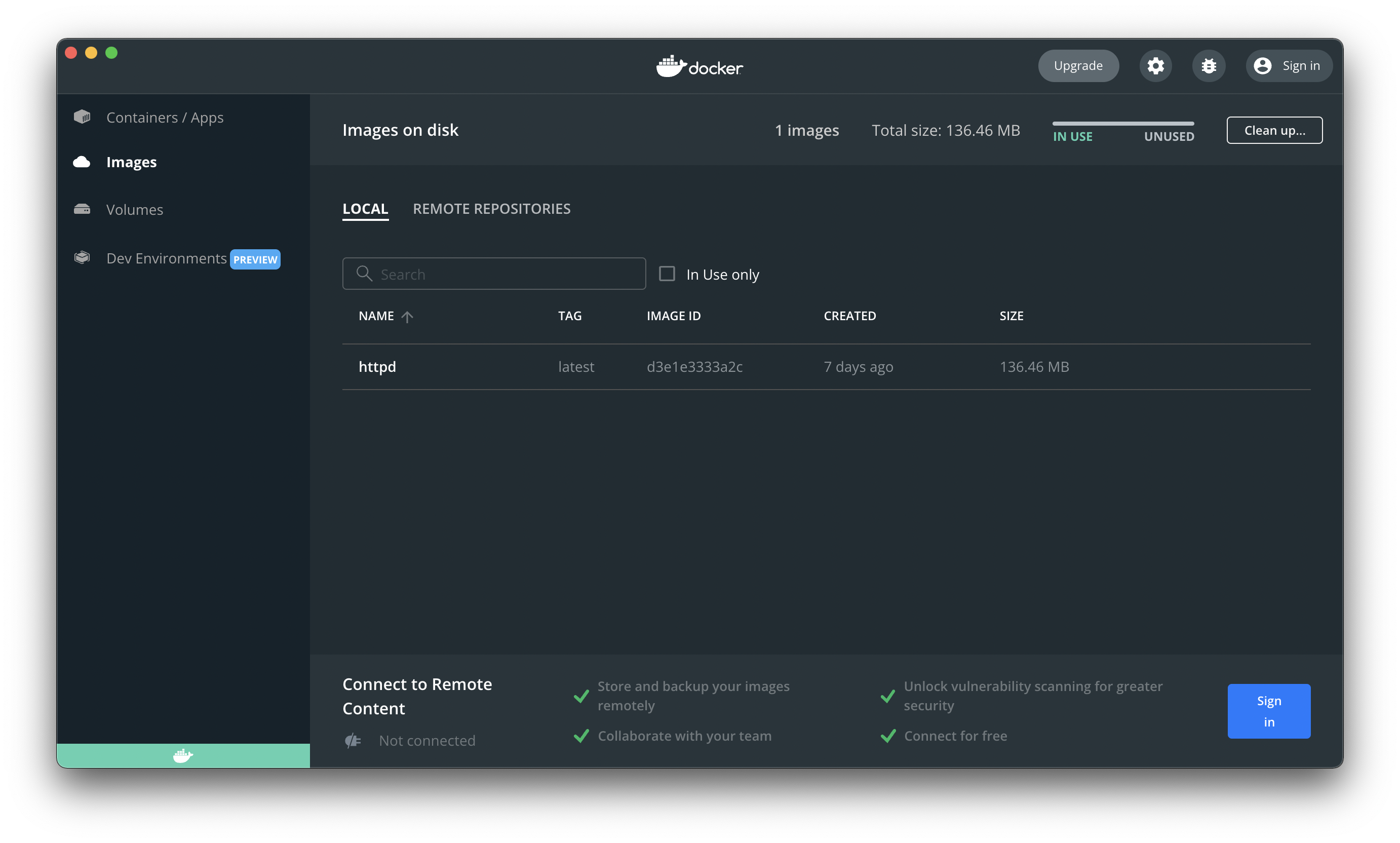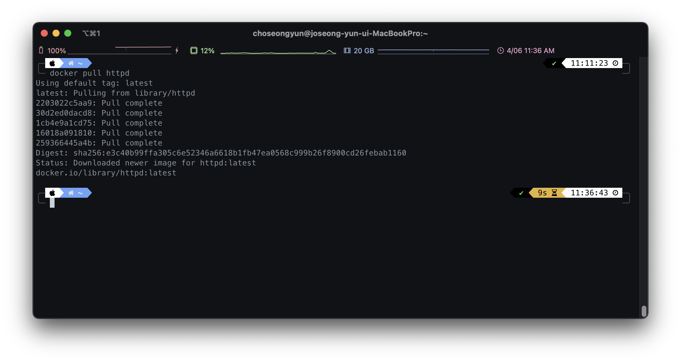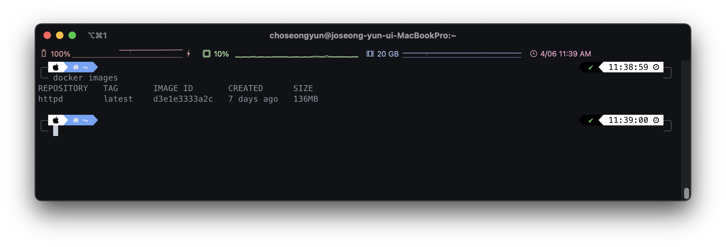 위 사진에 나온 httpd를 클릭하면 사용에 대한 매뉴얼이 나오게 되고, Image를 Pull 하는 명령어도 볼 수 있다. Terminal 창에서 "docker pull httpd" 를 입력하면 httpd image가 pull 된다. Pull이 끝난 후에 Image를 잘 가지고 있는지 확인하는 방법은 두 가지가 있다. Terminal에서 "docker images" 명령어를 통해 확인하는 방법이 있고, 아까 다운로드 받았던 Docker Desktop에서 확인하는 방법이 있다.