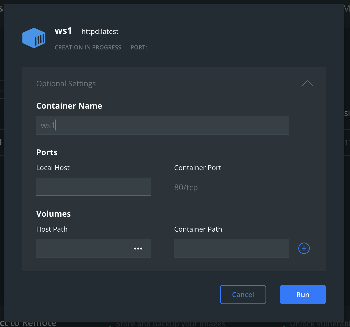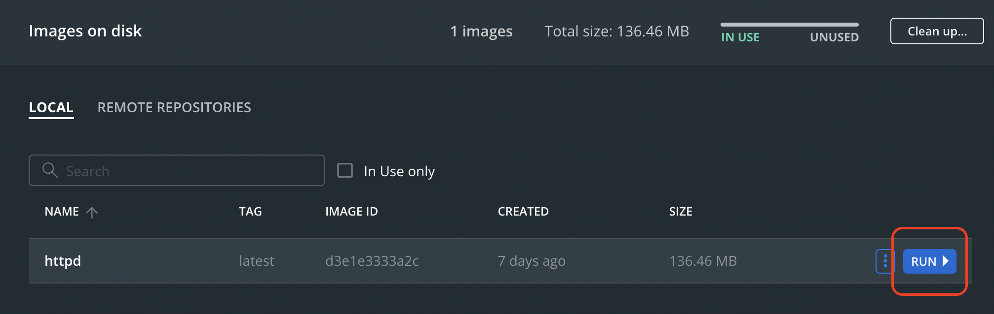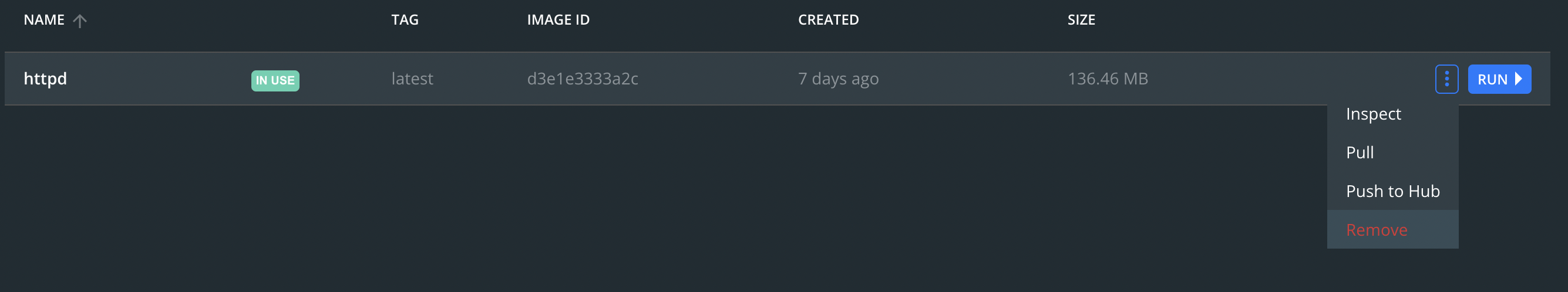 Docker Desktop의 로컬 Image 목록에서 httpd를 찾아서 커서를 올려두면, 오른쪽 끝에 RUN 버튼이 나타난다.