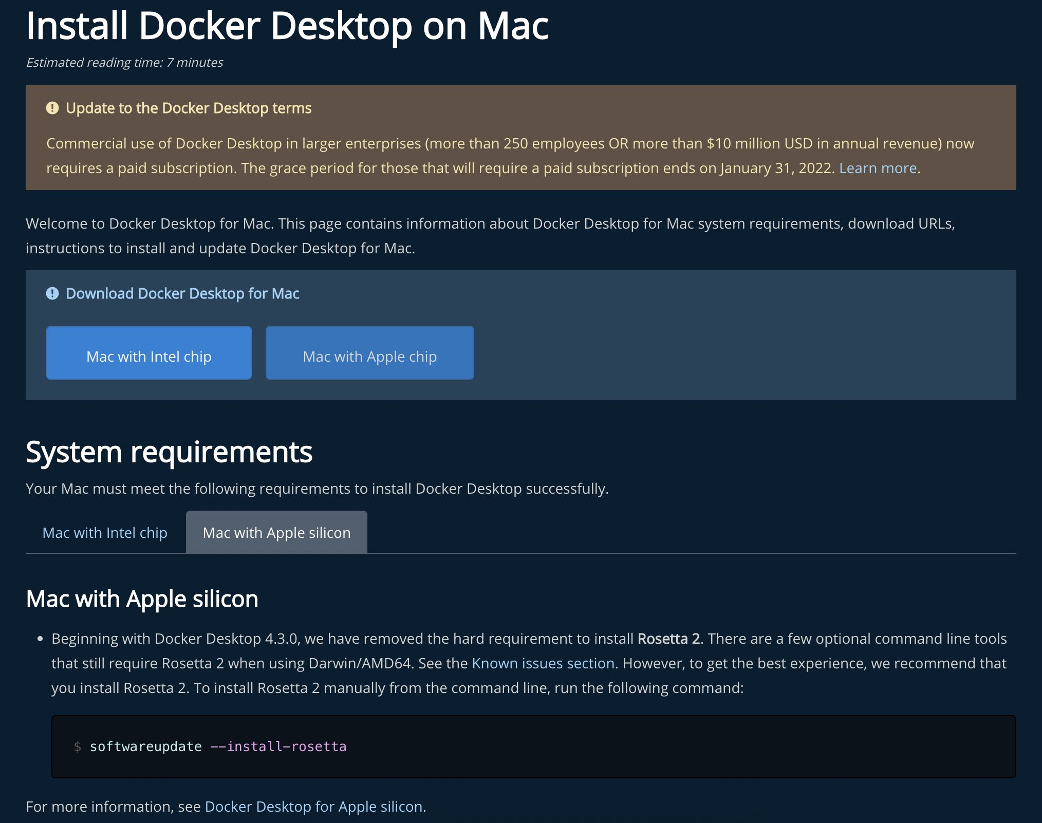 Docker Desktop은 공식 홈페이지에서 설치하는 방법과 Homebrew를 통해 설치하는 방법이 있다. 주로 Homebrew를 사용해서 많은 툴들을 설치해왔는데, 이번 Docker는 공홈에서 설치하는 방법을 따라가보고자 한다.
