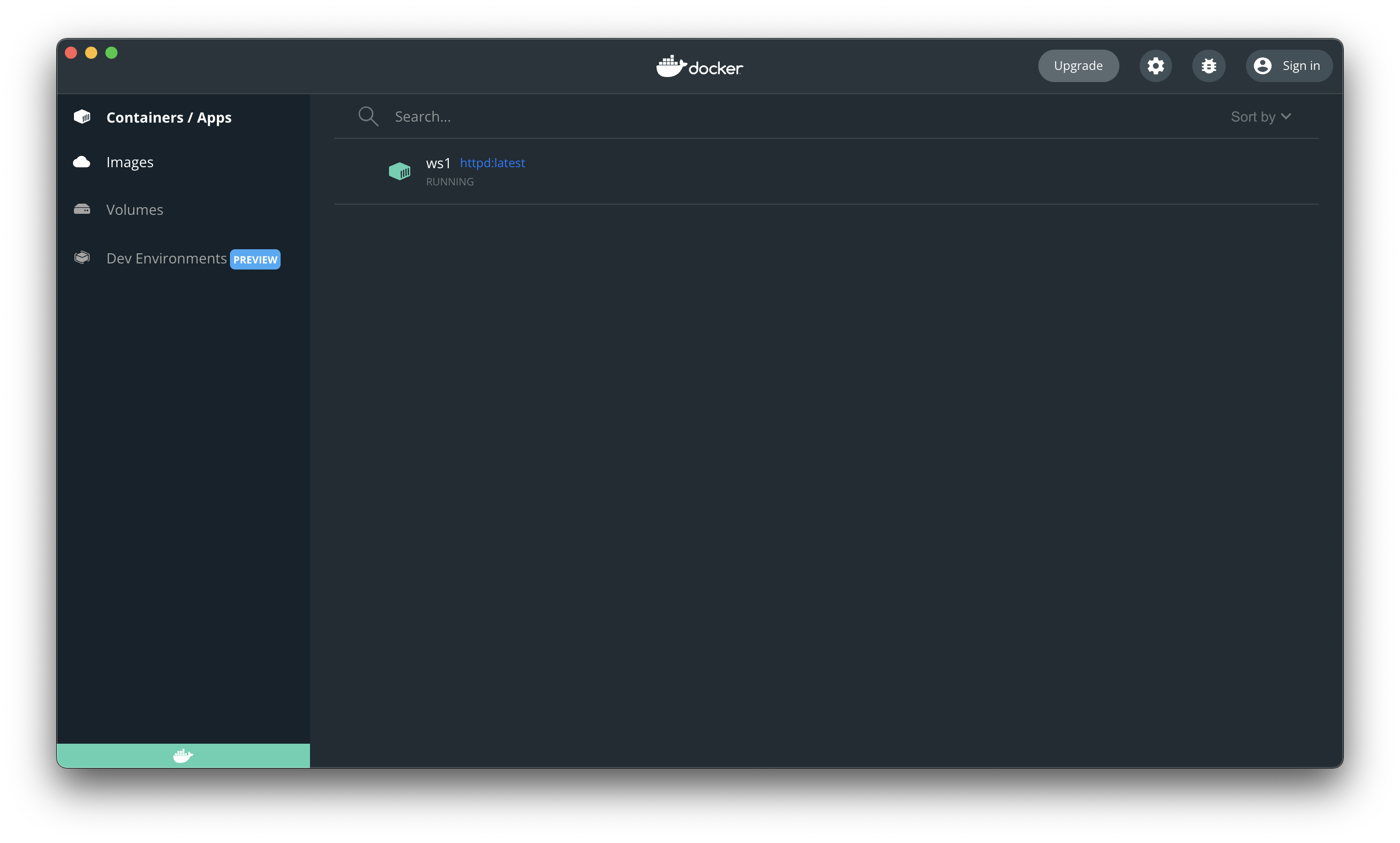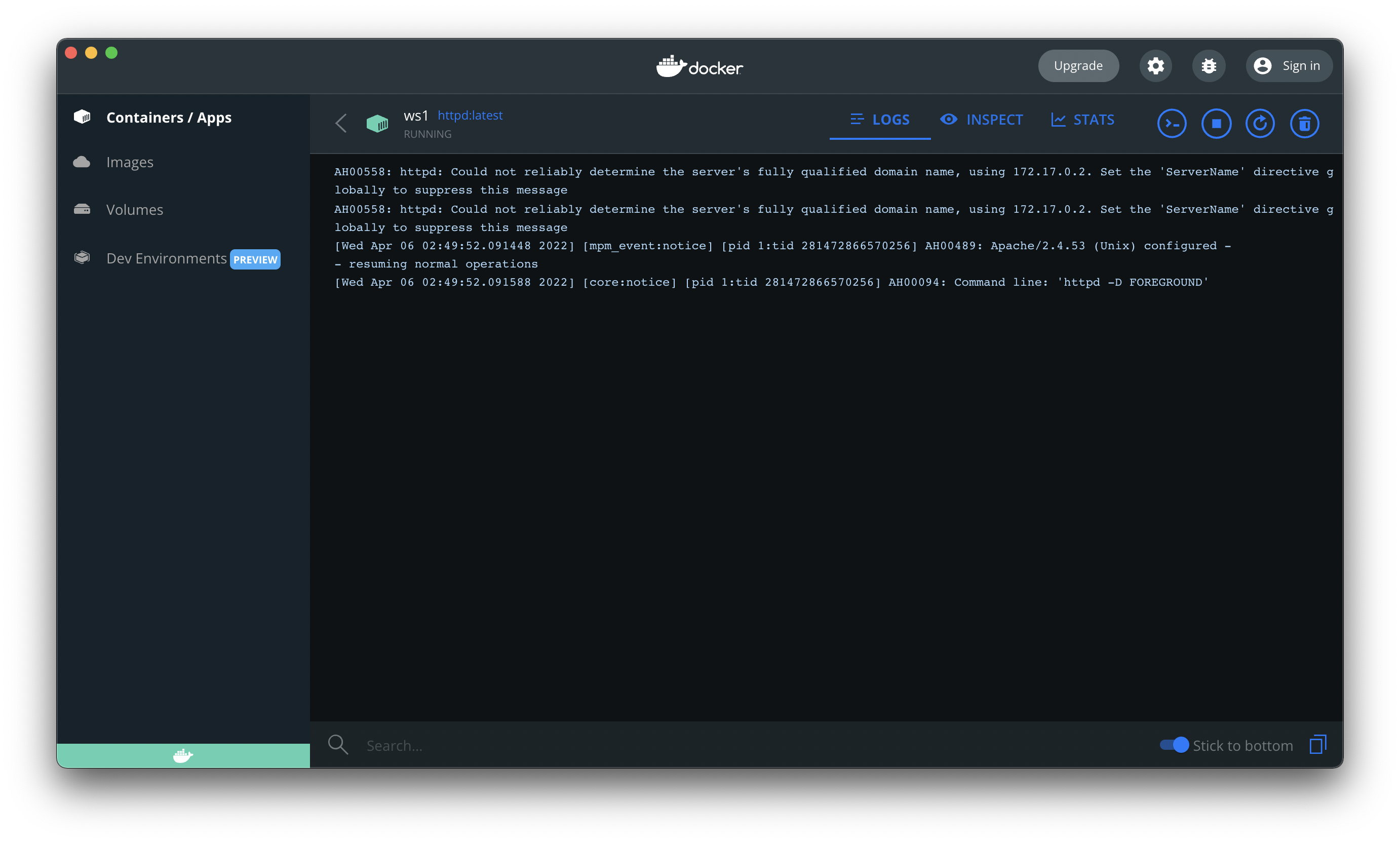 httpd Container를 Run 했다면, 이번에는 Container 내부에서 어떻게 돌아가고 있는지 보고 싶을 것이다. 방법은 간단하다. 위 사진에 보이는 ws1을 클릭하면 된다.