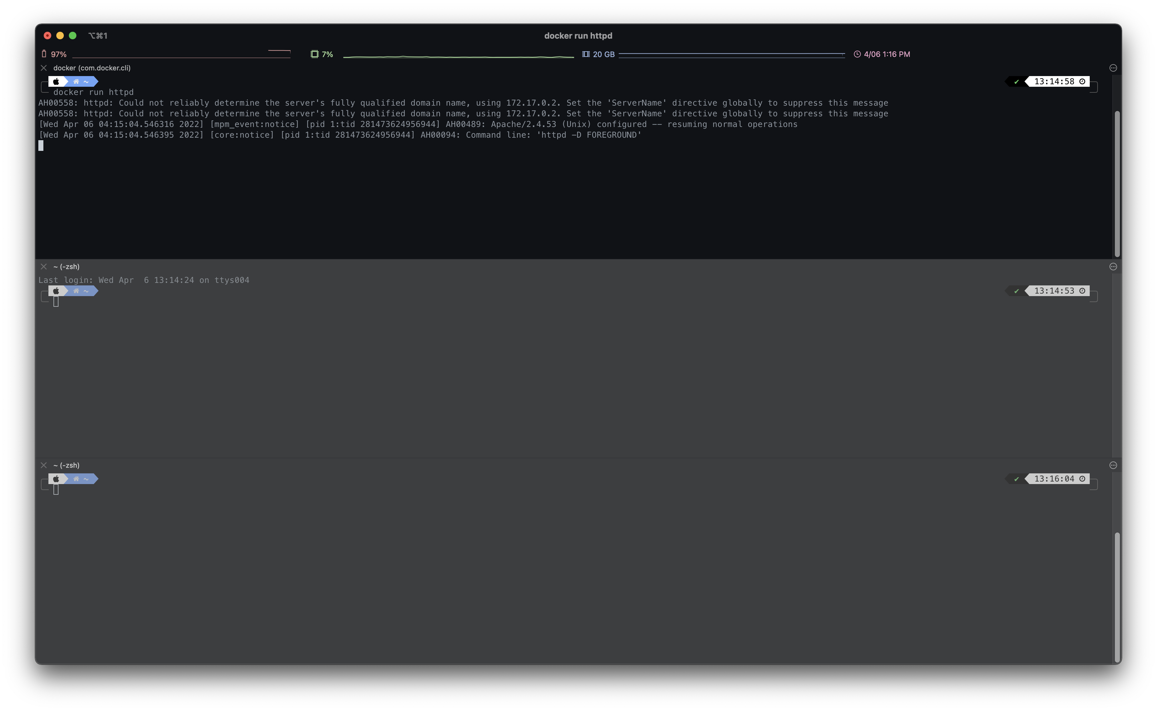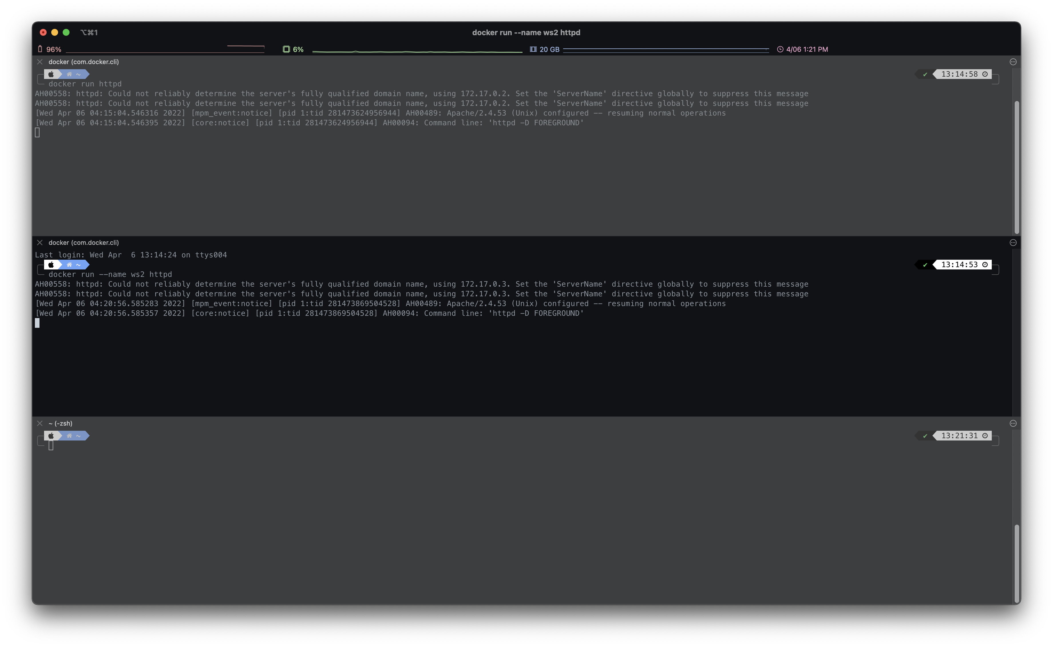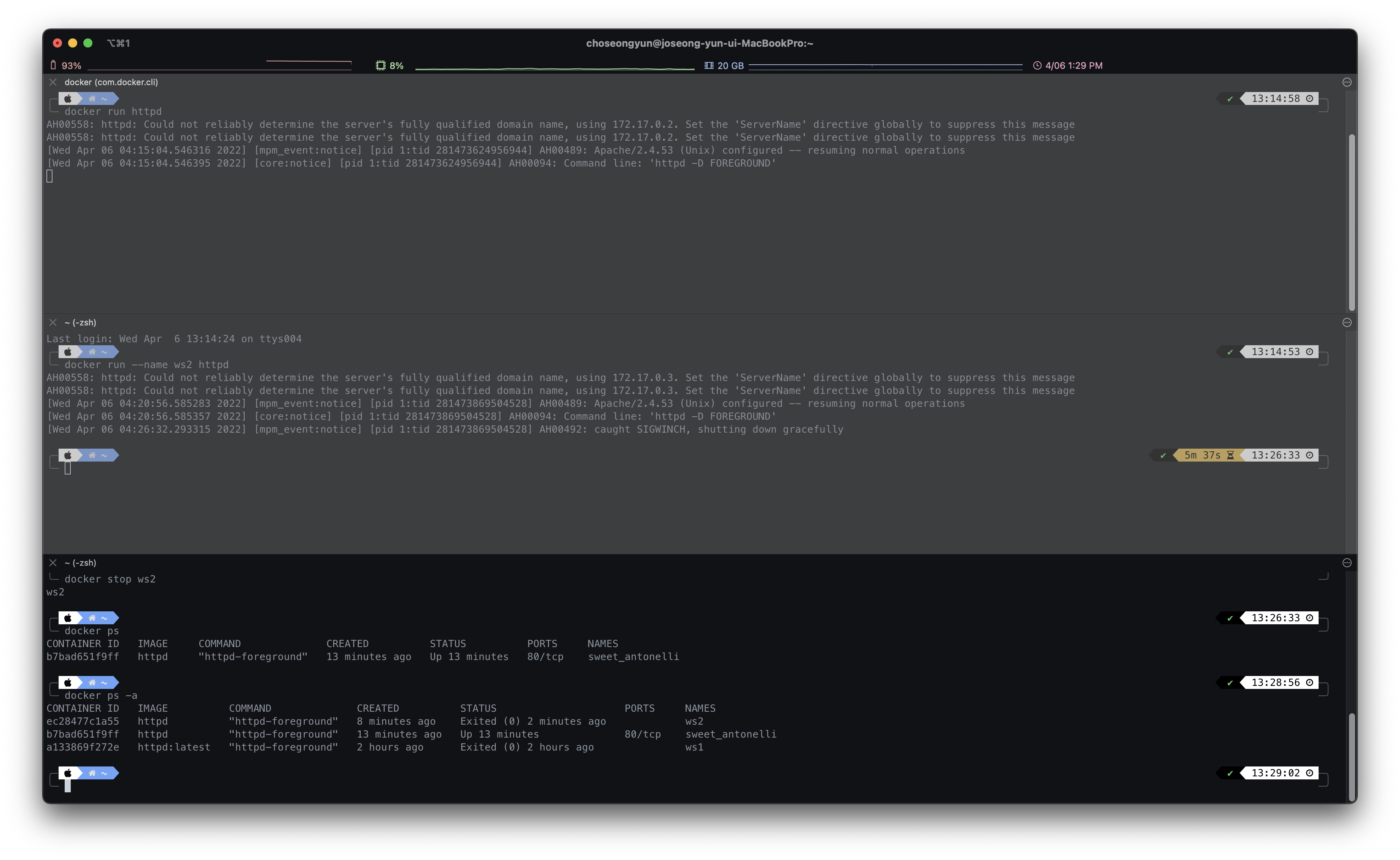 여러 터미널을 사용하여 "docker run" 명령어를 사용해보자.