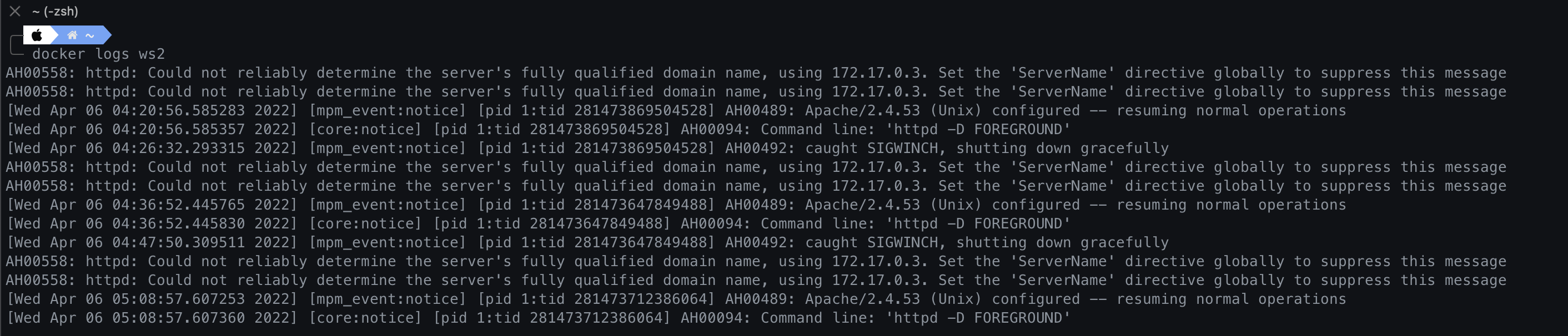 "docker start ws2" 를 하면 ws2가 출력되고, 끝이다. 아마 처음 Run 했을 때 출력되는 로그가 나오길 바랄 수도 있다. 그럴 때는 로그를 출력해주는 명령어를 입력한다. "docker logs" 명령어를 사용한다.