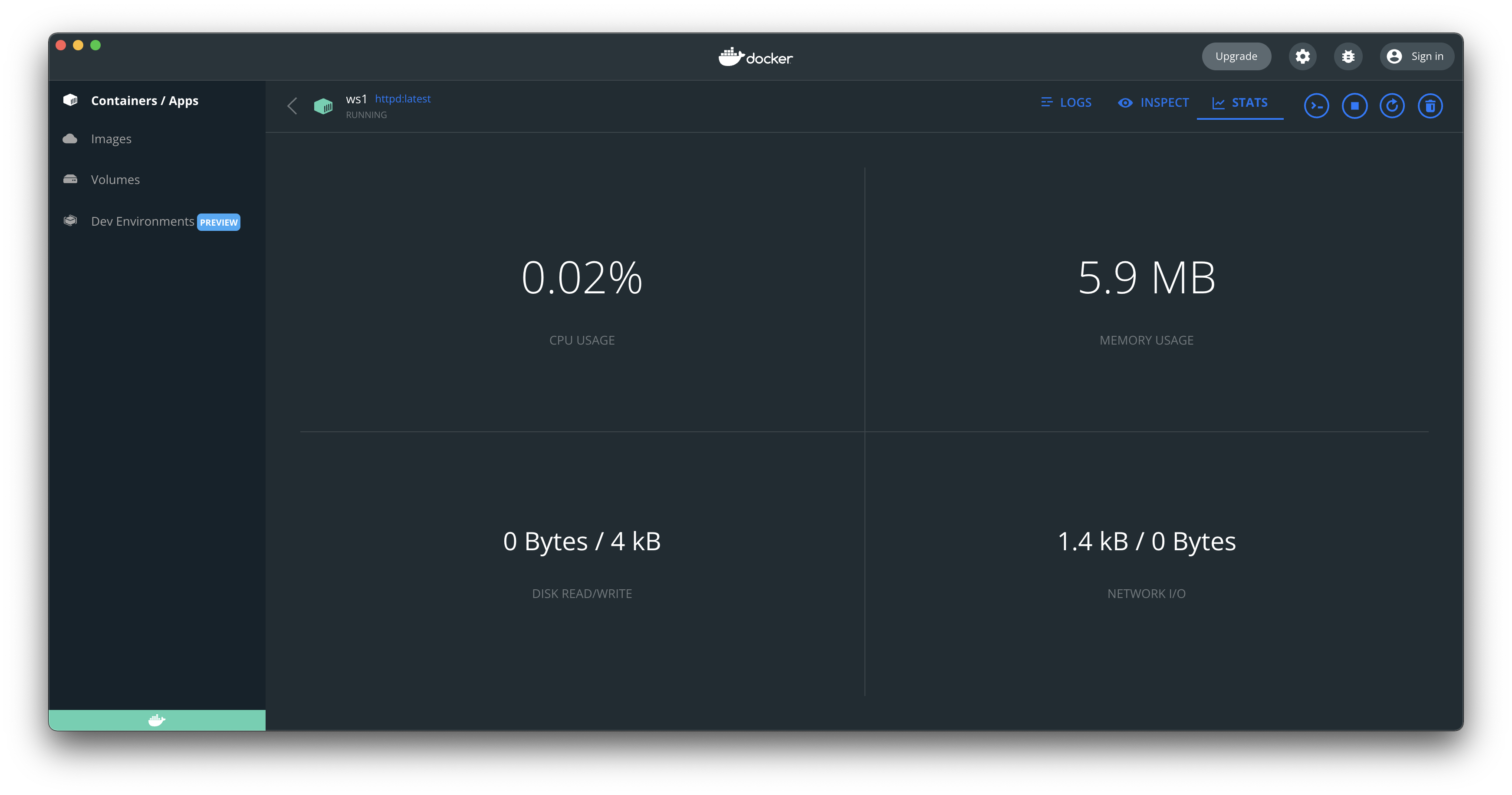 Container를 클릭하면 위와 같이 Container에서 출력하는 로그들을 볼 수 있다. 우측 상단에 [INSPECT], [STATS]를 클릭하여 현재 Container에 대한 전반적인 정보를 볼 수 있다. [STATS]에 들어가보면, "CPU USAGE", "MEMORY USAGE", "DISK READ/WRITE", "NETWORK I/O" 를 볼 수 있는데, 이와 같은 자원들은 모두 호스트 PC의 자원을 사용하는 것이다. 따라서 계속 켜두게 된다면 해당 자원이 계속 사용되는 중인 것이기 때문에, Container를 사용하지 않을 때는 잠시 꺼두는 것이 좋을 것이다. 그럴 때는 우측 상단에 익숙한 정지 버튼 모양을 클릭하면 된다.