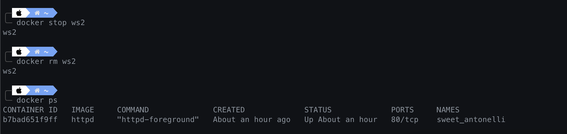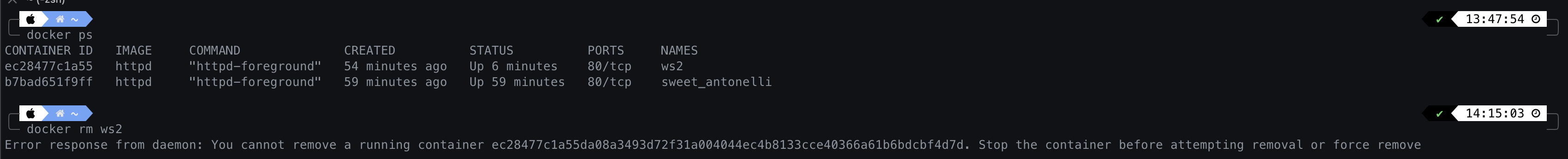 실행 중인 Container 'ws2'를 삭제하는 명령어를 입력하면 위 사진처럼 에러가 출력된다. 즉, 실행 중인 Container는 바로 삭제할 수 없다는 뜻이다. 그렇다면 아까 사용했던 stop 명령어를 먼저 쓰고, 삭제를 하도록 하자.