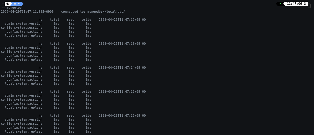 위에서 이미 MongoDB Server를 설치했다면, Terminal에서 바로 명령어를 사용할 수 있다. 예를 들어, MongoDB 모니터링 도구가 필요하다면, "mongotop" 명령어를 입력하여 현재 실행 중인 MongoDB의 상황을 실시간으로 지켜볼 수 있다.